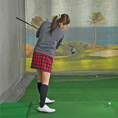 この練習ではスタンスの中央付近にボールを置くのがオススメ。トップのポジションで胸に当てたクラブの端がボールよりも右側を指し、フィニッシュのポジションでもクラブの反対側の端がボールの左を指すようにすればカラダの回転量を増やす練習になりますし、ストレッチ効果も高いです。