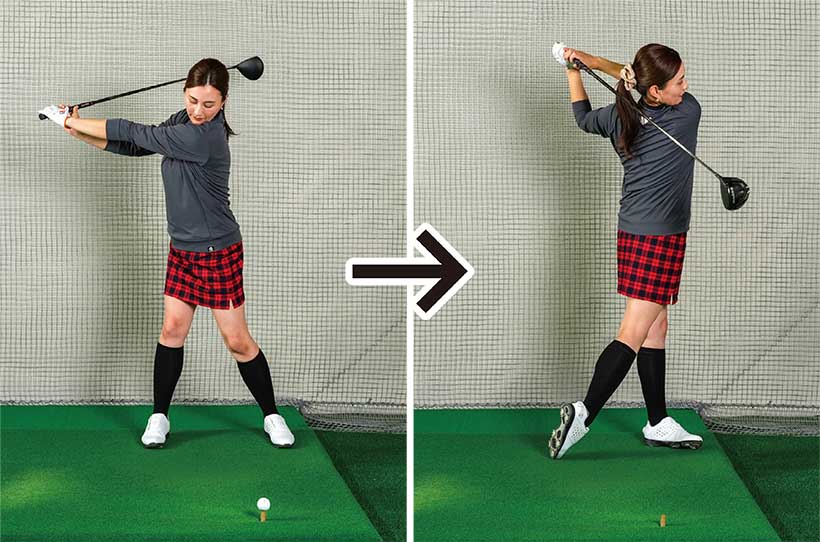 このときに上体が右に流れないように注意。カラダの軸を真っすぐにキープして回すようにすることです。