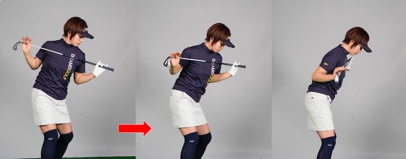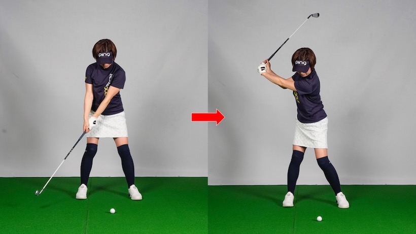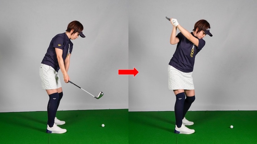 スイングでは「肩をタテに回す」と言われます。Mさんも実践していましたが、そこにちょっとした落とし穴がありました。結論から言うと、肩をタテに回し続けようとしていたために体が捻じれず、トップで体が反ってしまう感じになっていたのです。