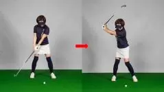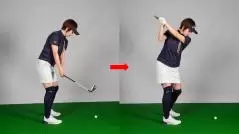 というのも、肩をタテに回す必要があるのはスイングのスタート時だけだからです。肩をタテに回すとは、パットを打つ時のように動かすということですが、そのスタイルでスイングし続けたら、誰がやっても体は回りません。つまり、スイングのスタートはパットのように肩をタテに回しても、ある程度行ったら肩はヨコに回らなければいけない。Mさんはタテに回し続けるから回らないのであって、体が硬いから回らないわけではなかったのです。