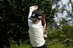 最後の「左上腕部が顎に当たるように」というのは結構大事。女子ツアーの試合をTVで観るとテイクバックでは左上腕部、フォローでは右上腕部が前顎に当たるから、ウェアにファンデーションがついています。ファンデーションがついている部分をチェックしてみてください。すごくわかりやすいですから。