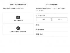 アプリを開いたら、下のメニューの「撮影・診断」を選択し、右下にある動画追加のボタンをクリックするだけ。そのまま案内に沿って、身長、クラブの種類(診断はドライバーのみ)、打点・視点(右打ちor左打ち、正面or後方)を選択し、撮影環境をチェック。