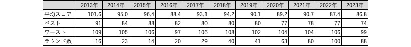 一方で、体が衰えているかといってゴルフのスコアが悪くなっているかというと、今のところ影響はありません。私は2011年、36歳の時にゴルフを始め、現在は48歳です。2013年からスコアを保存していますが、平均スコアは毎年改善しています。ヘッドスピードが61m/sにアップした2020年よりも、ゴルフ肘で苦しんでいるここ数年の方が平均スコアは良くなっています。30代後半から40代前半の頃は体が元気でも、ラウンド数がなかなか増やせなかったことも影響していると思いますが、スコアが良くなっている理由をこの後考えてみたいと思います。