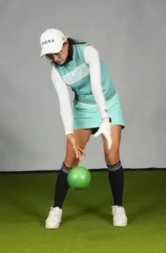 遠藤 手を使わなくてもそうなるドリルをやりましょう。やり方は簡単で、重いものを持ってダウンスイングの要領で動き、それを地面に落とすだけです。ここではトレーニング用のメディシンボールを使いますが、これを自分の右側に落とすようにするんです。手を使って下ろしてくる人は体の前や左側にボールが落ちます。