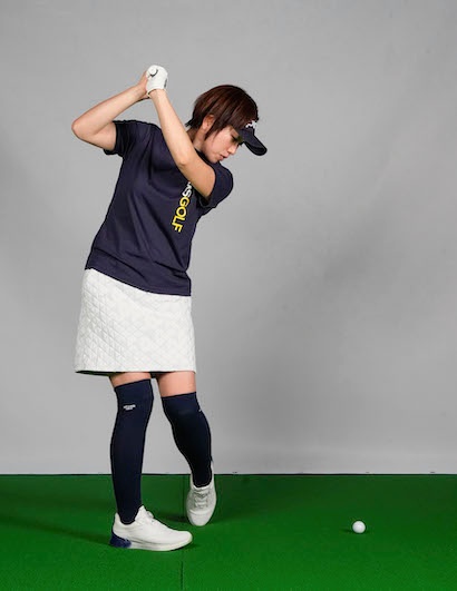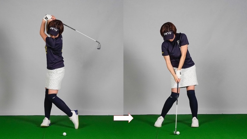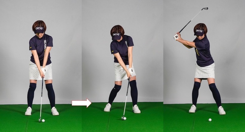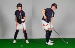 このようにすると腰が回りすぎます。そもそも腰は45度くらいしか回らないもの。それがFさんのスタイルだと60度くらい回ってしまい、バックスイングで腰が完全に右向きになります。これは女性ゴルファーにもよく見られる形。本来は下半身と上半身で捻転差を作りたいのですが、これでは捻転差ができません。下半身を全部回しますからスイングの再現性が低く、速く振れないためヘッドスピードも上がりません。結局インパクトでボールに当てに行きフリップ気味になってしまいます。