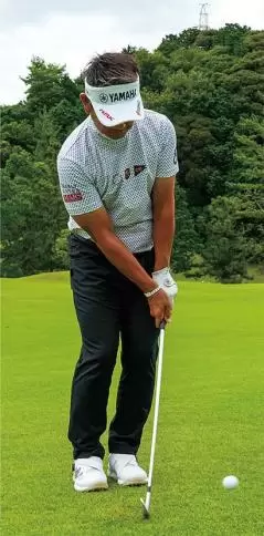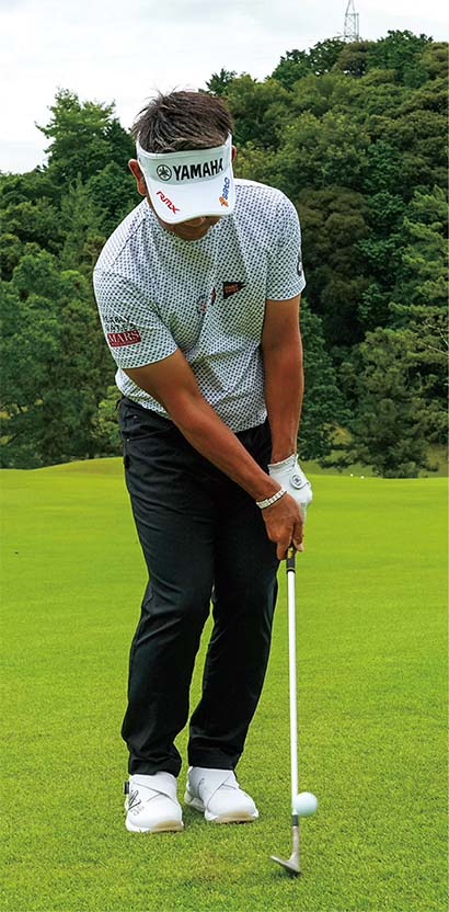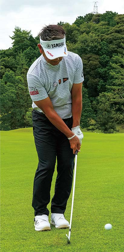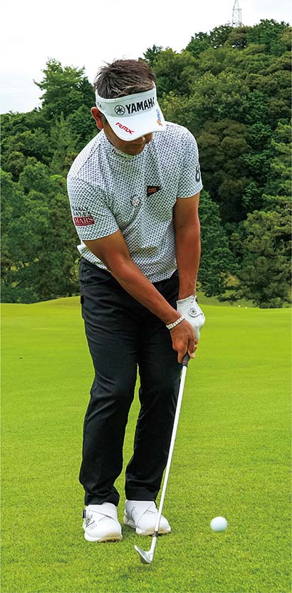 体重配分は、7番でコロがす時は左8対右2くらいの左足体重に、ウェッジで高く上げる時は5対5の左右均等にします。クラブは短く握ったほうが、構えが小さくなり、ミート率が良くなります。
