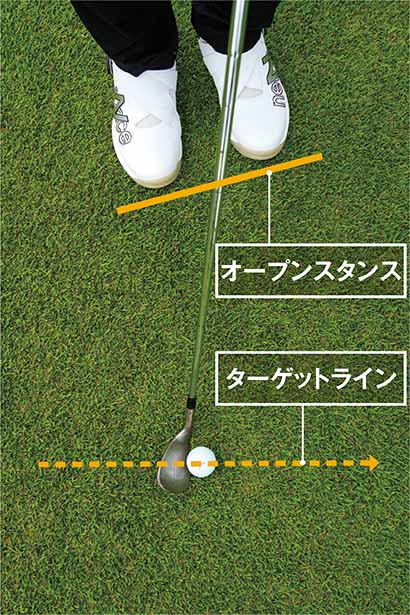 グリーン周りのアプローチはボールを遠くに飛ばす必要がないので、「小さく構える」ことが鉄則です。スタンス幅を狭くして、スタンスを少しオープンにしたら、右足親指の前にボールをセット。そして手(グリップ)を左太モモの内側に置き、ややハンドファーストに構えます。