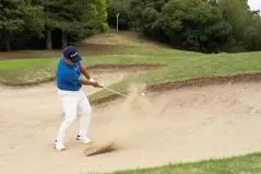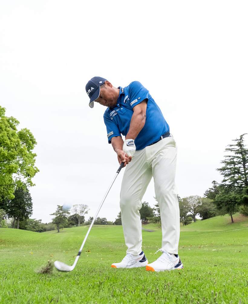 「Vソールはヘッドが多少上から入って入射角がキツくなってもダフりません。また、ボールを右に置いてランニングアプローチをする時もすごく使いやすいようにできている。これはリーディングエッジ側の面取りの効果でしょうね。ソールの後ろ側を削ってあるのもいいところです。普通はこの部分のソール幅が広いと、どうしてもフルショットした時の振り抜きが悪くなりがちですが、Vソールは一番当たりやすいソール部分を絶妙にカットしてあるのでフルショットしても気持ち良く振り抜ける。距離を合わせる場合とフルショットの両方に対応できるよう、よく考えられているなぁと思いました」