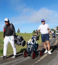 キャディバッグを担ぐか、手引きカートを使って、自分の足で27ホールをプレーすることがアイアンマンカップの醍醐味です。ただし、手引きカートの貸し出しなどは行なっておりませんので、ご使用される方はご自身でご持参いただく必要があります。