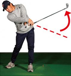 左腕を引き付けながらローリング。フェースターンを抑えないことでヘッドは低く左下に抜けるが、絶対にヒッカケにはならない。