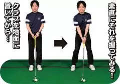 ハンドファーストのカタチでアドレスしてしまうのではなく、まずはクラブを地面においてシャフトを真っすぐにします。そこからスタンスを開いて、素直にグリップを握ってアドレスしてみましょう。これだけで変なクセが矯正されるので練習前に確認を。