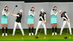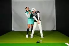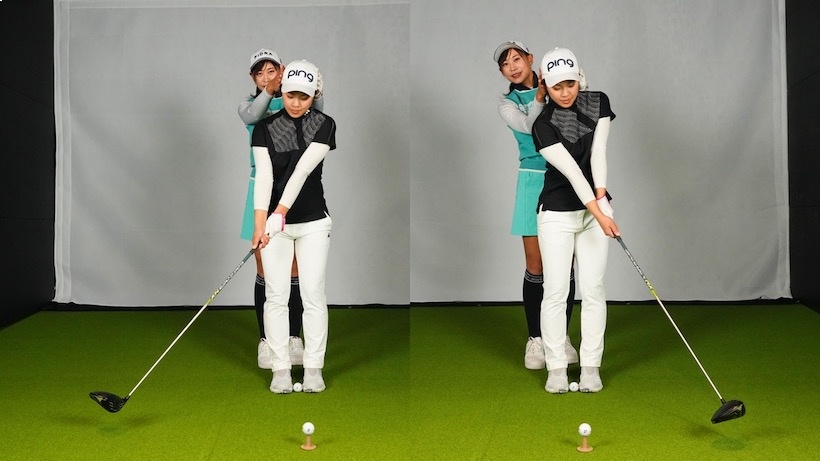 遠藤 突っ込むにしても、リバースピボットになるにしても、体の動きに伴って頭が大きく動いているのが今の美優さんです。突っ込む時には切り返し以降で左に動き、リバースピボットになるとバックスイングで左、切り返し以降で右にかなり動きます。こうならないように、頭の位置が大きく変わらないようにスイングしてみるんです。