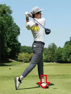 理想的なフィニッシュとは胸がターゲット方向を指すくらいまでカラダをしっかりターンし、左足だけでも立てるような体勢です。ボールが地面に着弾するまでの数秒間は振り抜いた体勢のままでバランスよく立っていられるのがベストです。フィニッシュへと振り抜いた瞬間に体勢が崩れてしまうのはキレイなスイングができていないことになります。