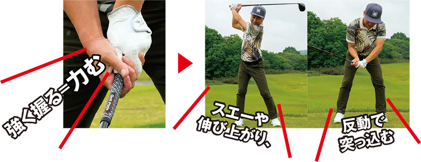 手が滑りそうと感じると、グリップを強く握る力んだ状態になる。するとトップが浅くなり補完するために「伸びあがり」や「スエー」を生む。その結果、「前」や「左」に突っ込んでミスショットが出やすくなる。