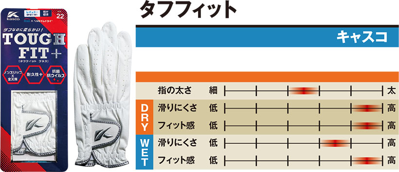 生地の厚みが薄く、ソフトでしなやかなので、握った時の“突っ張り感”が無く、フィット感が抜群です。ドライでもウェットでも滑り感は全く無く、乾いた状態よりも少し濡れている時の方がより滑りにくく感じます。