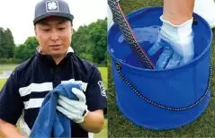 雨に加えて、グリップとグローブを水に漬け、余分な水分をタオルで拭きとってテストした。