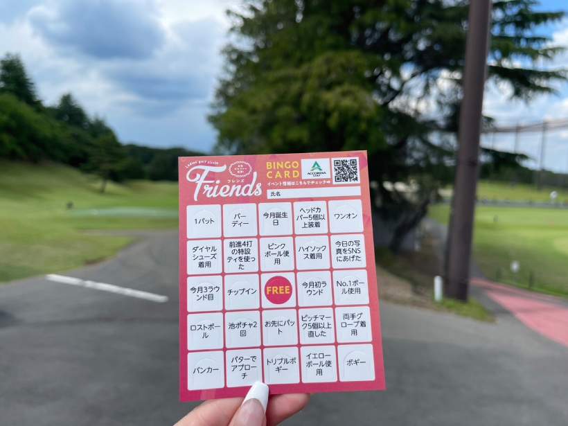 ラウンドのスタート時には、フレンズ(後述)のイベントではお馴染みだというビンゴカードが配布された。どんなゴルファーでも楽しかったと思えるよう、スコアに関係ない内容、「目土する」、「ゴルフ保険に入っている」、「カート道路直撃」、「キャラクターヘッドカバーを使用している」、「今月初ラウンド」など、カードによって内容も様々なので、毎回楽しいと大人気なのだとか。個人的には、「池ポチャ2回」がお気に入り。どうしても球が上がりづらい女性ゴルファーにとって、池ポチャしてもビンゴ埋められるからまいっか!とミスもポジティブに変わるのが嬉しい。コンペ賞品はこのビンゴの成績でもらえるというからいつもと違った楽しみができるのだ。