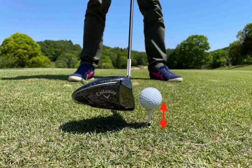 最後に具体的にどれくらいティアップを高く、あるいは低くすればいいのかですが、よくティアップの高さの目安はドライバーをソールした時にヘッドの上からボールが半分出るくらいといいます。もちろん練習場の環境やコースの芝の状態でも変わりますが、数字にすると実測で38ミリくらいが最適です。理想は、38ミリを基準に1ミリ単位で調整すること。「少し高く」ならプラス1ミリ、「少し低く」ならマイナス1ミリという感じで、プラス・マイナス2ミリくらいがマックスと考えてください。これ以上高く、あるいは低くすると打点が高すぎ、低すぎになって芯を外しすぎます。