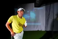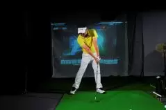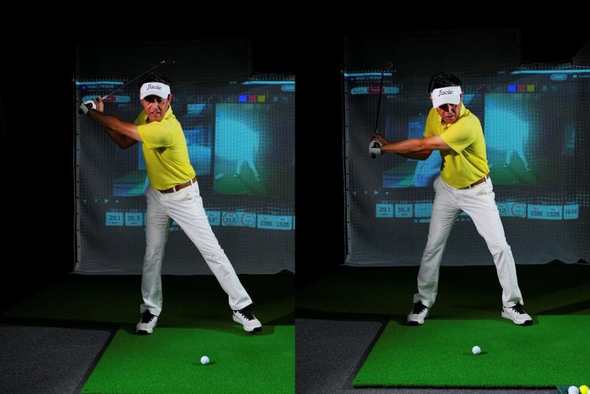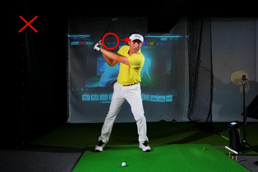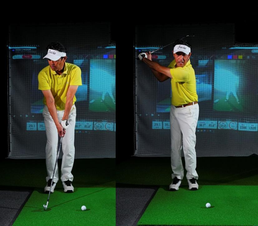 「イメージとしては『イチ』クラブを上げました、『ニッ』左足にしっかり体重を乗せました、『サンッ』ここで初めてスイングします。です。インドアですので『イチ、ニッ、サン』と声に出してやるのもいいでしょう」(内海プロ)