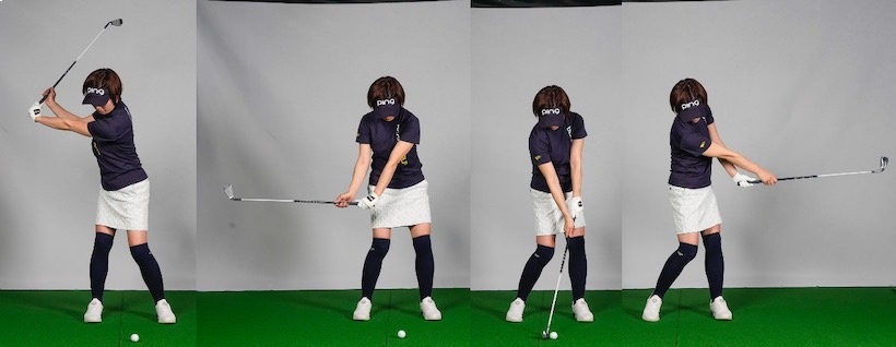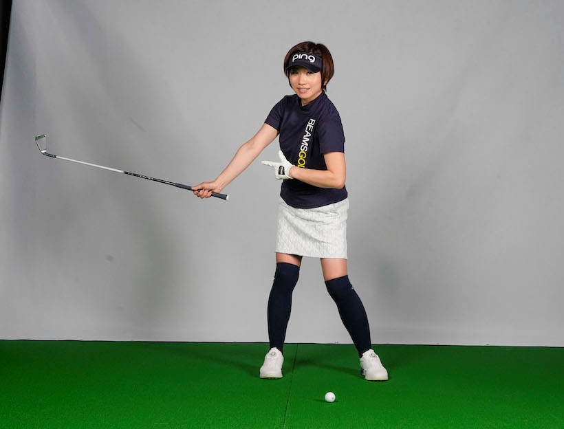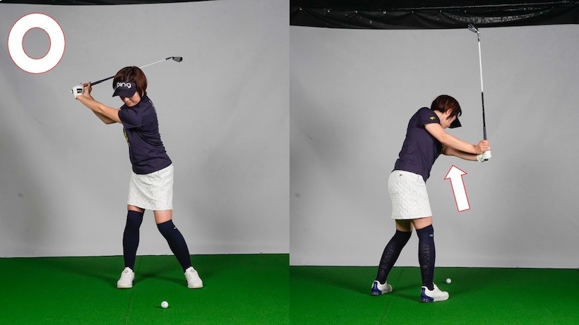 右腕をなるべく伸ばしてテークバック。バックスイングで右ワキが開いちゃう人は試してみて!【勝又優美・アマチュアの悩み解決】