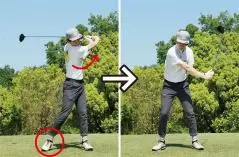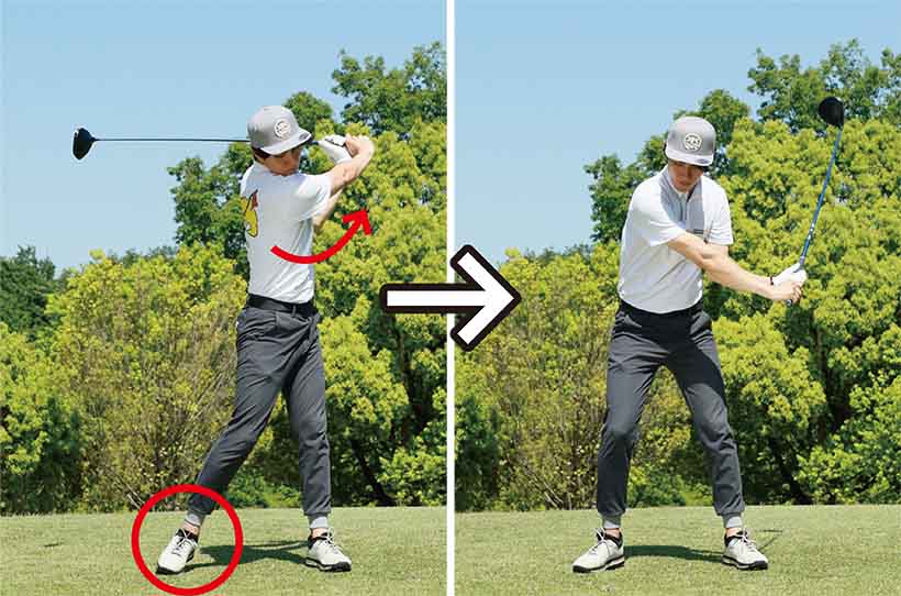 慣れないとバランスが保ちにくいでしょうし、バックスイングがうまくとれないようなら右カカトをヒールアップしてカラダの回転をサポートするのもOKです。