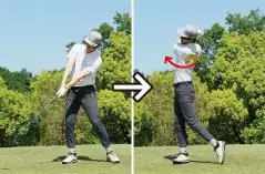 フィニッシュからはカラダを捻り戻し、そのままトップの位置へと持っていきます。トップとフィニッシュを往復させるのが連続素振りです。