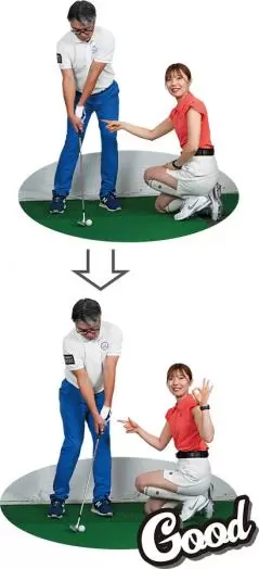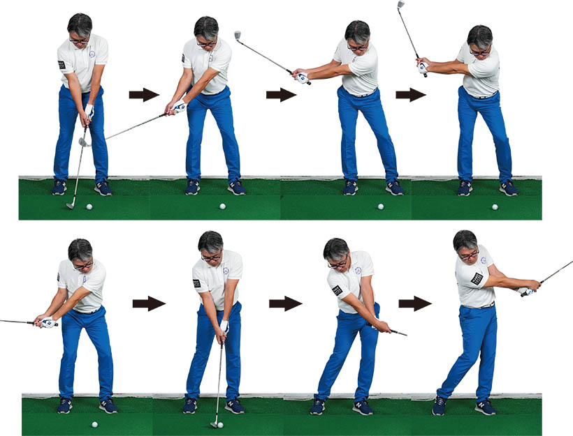 (写真右)右手だけでクラブがスティックを追い越してしまうのもNG!