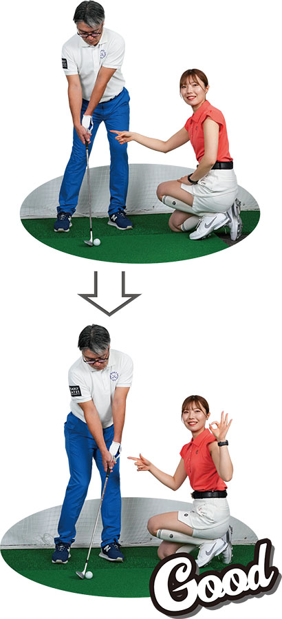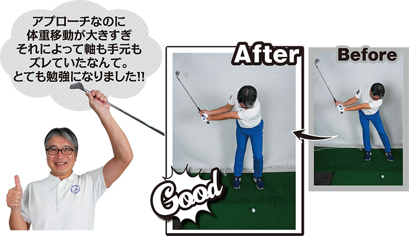 アプローチは小さい振り幅でスイングするため大きく体重移動をすると軸が右に傾き、インパクトで手首の動きが増えて手元の位置が安定しないことがミスに繋がっていた。