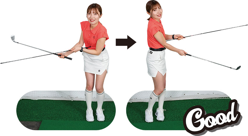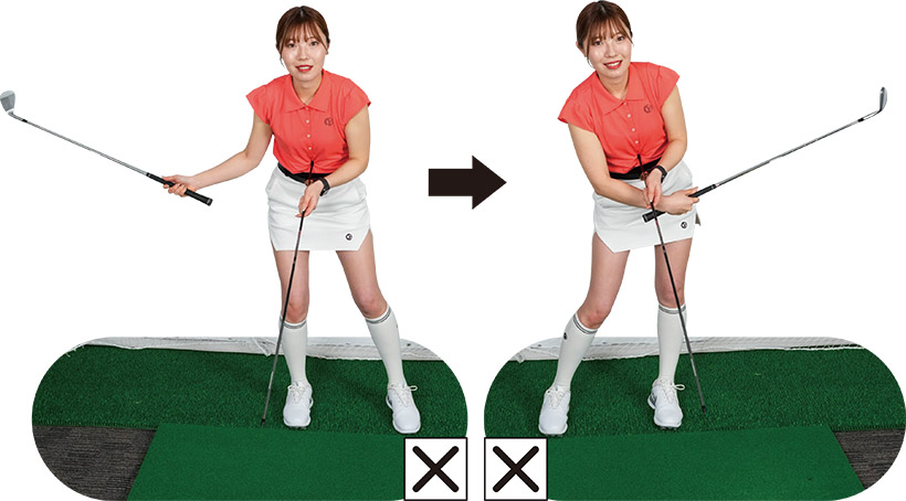 (写真左)右へ体重移動して上体が正面を向いたテークバックはNG!