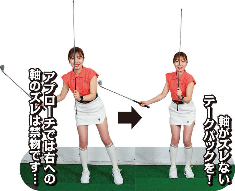 アプローチでも気付かないうちに右への体重移動をしてしまっていることがあります。左手で持ったスティックで、テークバックのときの軸がどこにあるのかを確認してみましょう。アドレスと同じ位置ならOK。右へズレていたら体重移動を抑えましょう。