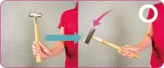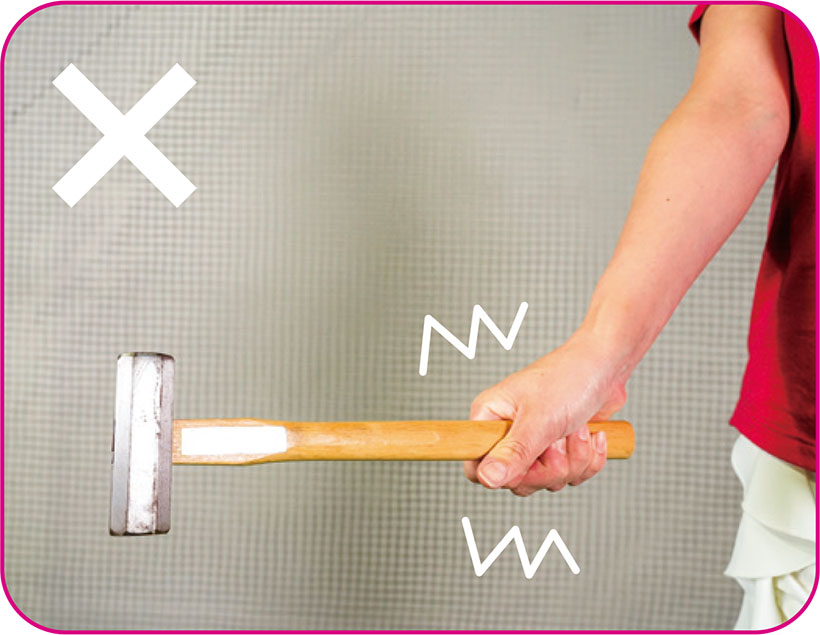 右手のヒラでギュッと握るように持つと右手首が稼働しにくいし、金づちの重さを利用できないため釘を正確に叩くのが難しくなります。右手の指のほうでやわらかく握って持てば右手首を利かせやすく、釘をキレイに叩けます。そのような具合に右手の指をグリップに引っかけるように握り、右手首が使いやすいソフトな握り圧をキープしましょう。