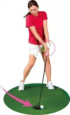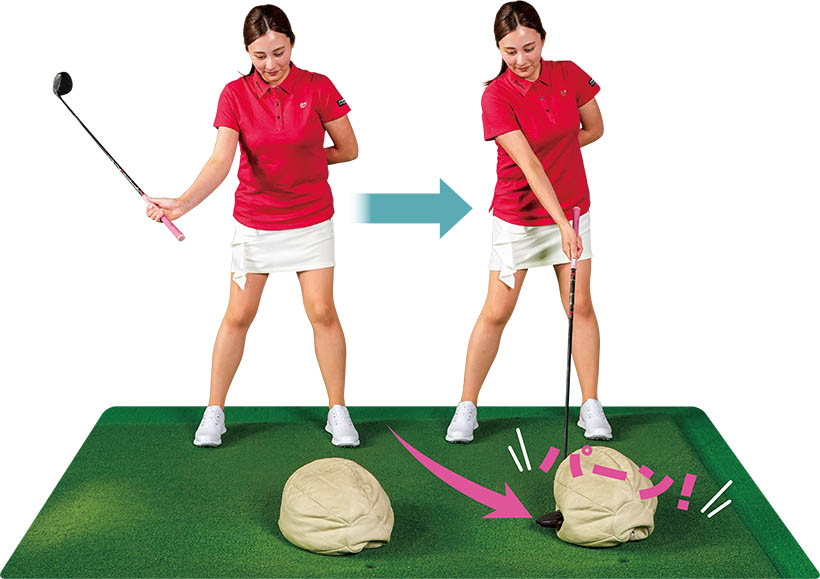右手の理想的な握り方を知るには右手だけでクラブを持ち、クッションを叩く練習がオススメ。ボールを打つ練習だけではきちんと当てることばかりに気持ちがいって、右手首をこねるような動きになりがちです。クッション叩きで右手でしっかりと叩けるような右手の握り方と握り圧、右手首の稼働を体感してください。