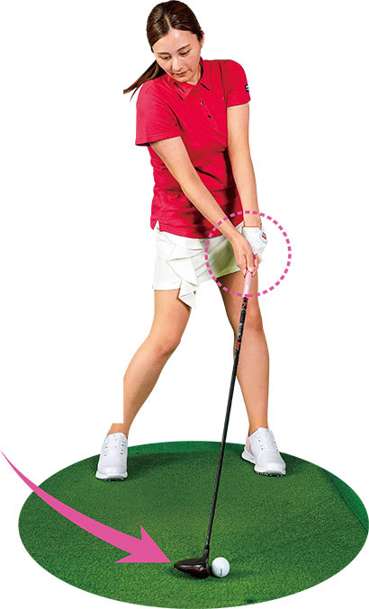 そして、もう一つ大事なのは右手のヒラとフェース面を一体化させること。アドレスでフェース面をターゲットに向けますが、右手のヒラもターゲットに向けて構えましょう。インパクトは右手のヒラでボールを叩くイメージ。これでフェース面がスクエアに戻りやすく、ボールを正確にとらえられるようになります。