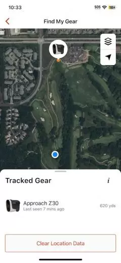 万が一『Approach Z30』をコースに置き忘れた場合「Find My Garmin」機能で、最後にアプリ(スマートフォン)とのBluetooth通信が行われたときのデバイスの位置情報を表示し、見つけ出すことができます。