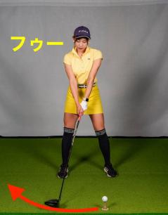 ではどうするか。私はアドレスする時に「フーッ」と大きく息を吐くことをおすすめします。この時、腹筋を意識するのがポイント。息を吐きながら腹筋に力が入る感じになればOKです。
