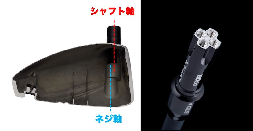 「軸ズレ構造」も健在だ。ロフト角とライ角を調整できる“カチャカチャ機能(可変構造)”がありながら、シャフト軸と装着ネジをずらすことで、ヒール周辺の薄肉エリアを確保し、ヒール側を含めたフェース全域をたわむように設計。高初速エリアが約20%UP、ヒール寄りのミスショットにも対応可能なヘッドとしている。