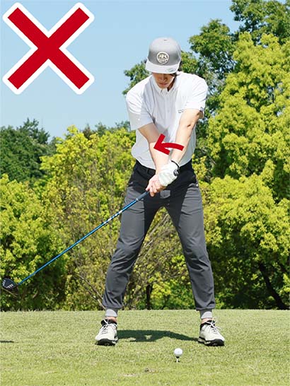 カラダが止まったままで手が先に動いたり、お腹が回ってもクラブがほとんど動いていなかったりではNGです。