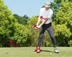 そこで、もう一つ必要になるのがフォワードプレスです。反動を利用することでテークバックをスムーズに始動させる手段ですが、軽く足踏みするように重心を両足交互に乗せたり、手元や右ヒザをいったん目標方向に軽く押し込んで元に戻すと同時にテークバックをスタートさせたり人によってやり方は違いますが、リズムを感じながらクラブを上げていくという点では共通です。