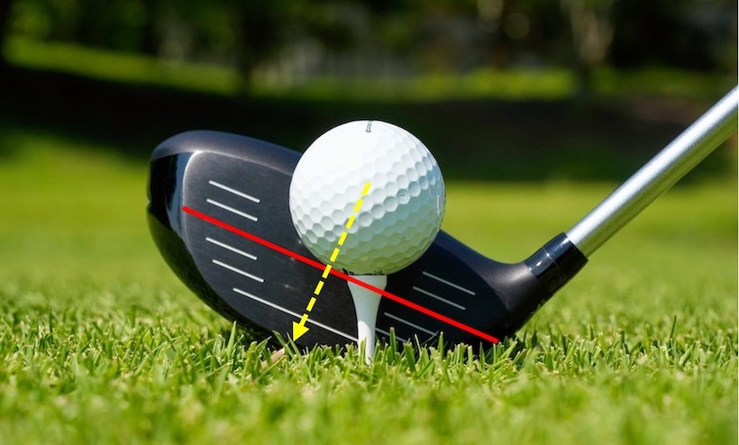 なぜでしょう? 結論から言うと、ヘッドのややトゥ側にボールがくるように構えないと、フェースの芯で打てないからです。その理由は以下の通りです。例えばドライバーを本来のライ角通り、地面とフェースのスコアラインが平行になるようにソールした場合、上の写真のようにフェース中央にボールがくるように構えれば、ボールはフェースの芯のあたりにきます(写真上)。