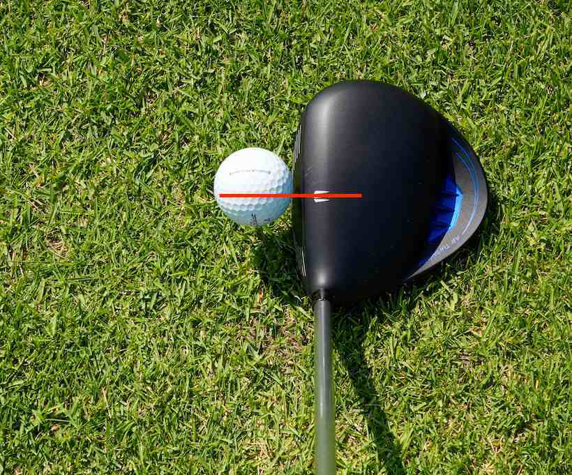 目安としては、ボール半個~3分の1個分ほどトゥ側で構えますが、人それぞれアジャストが必要です。これはアドレスでトゥ側が浮くことによって生じる錯覚のようなものですから、構えている本人は全く気づきません。疑心暗鬼な方は、いつものようにアドレスした時のボールとクラブヘッドまわりを、飛球線側から撮影するといい。百聞は一見に如かず、見れば一目瞭然です。