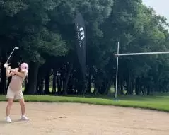 「こちらは通常プレーです!」と言われたホールのはずなのに突如現れたのは、バンカーチャレンジ。高跳びの棒がバンカーに用意されており、決められた線から決められた高さを超えてバンカーを出すというもの。バンカーを打ちすぎて、バンカーが得意になってしまった私もルンルンで参加し、見事ナイスアウト!「楽しい〜〜〜!」