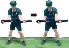 「さらに動きをよくするには、ゴムバンドを付けたまま、ヒジの高さでタオルなどを持って体を左右にヒネります。ゴムバンドから上の部分と下の部分がバラバラに動くようイメージして体をヒネってください。タオルの高さが変わったり上半身に下半身がついてきたりしてはいけません。つかんでいるタオルの長さが変わってもいけません」(宮澤氏)