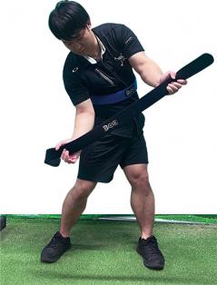 この状態でシャドースイングをしてトップの形を作ったら、ゴムバンドの部分から上はトップの形に置き去りにして、ゴムバンドの部分から切り返すようにすると胸椎と腰椎がバラバラに動いてくれるようになるという。