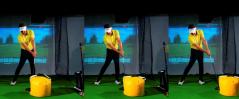 今回は「インパクトバッグ」! 布などがつめられ重くなった、いわばゴルフ用のサンドバッグをクラブで叩く練習だ。
