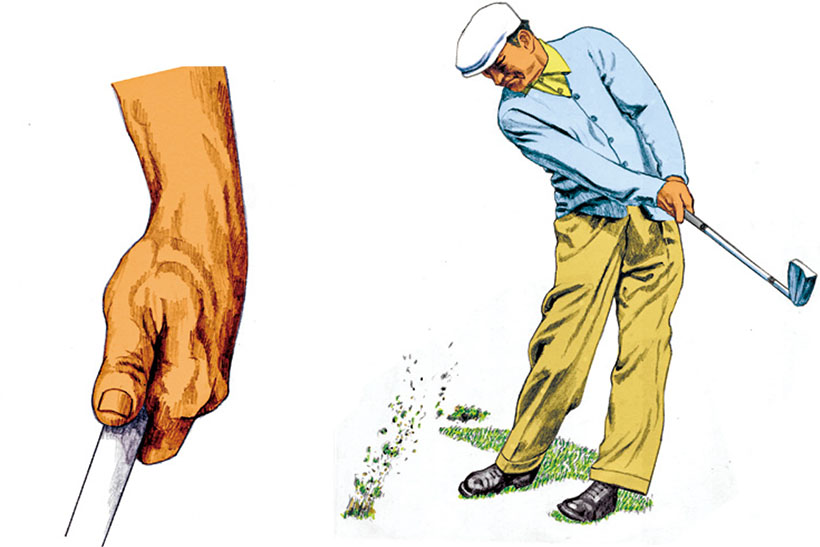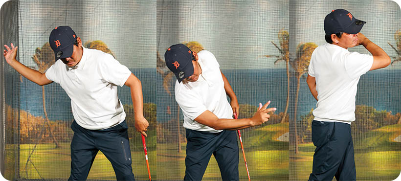 そこで大切なのが、左サイドによるグリップエンドのたぐり動作です。左手の3本指、左ヒジ、左肩などでたぐることで、ヘッドがスムーズにリリースされて、厚いインパクトにつながります」