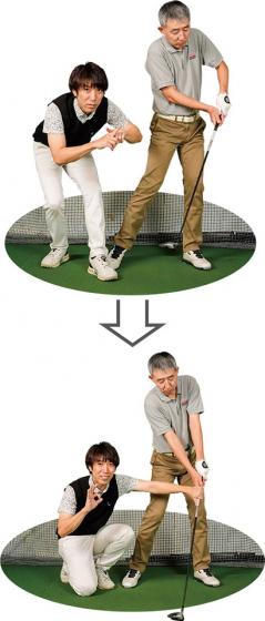 力みによって各関節が固まってしまいがちな人は、まずクラブを持たず両手を下にだら~んと下げます。リラックスさせたその腕を、クラブを振る要領でテークバックし、腕の重さを感じたままフィニッシュまで素振りします。関節の力みが自然と抜けます。