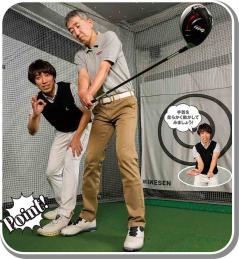 (写真右)クラブの遠心力をイメージすれば体の軸ができます!!