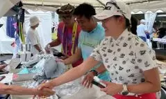 ちょうど昼どきで近くの飲食店のブースに来ていた人も多かったこともあり、ヨネックスのブースにはあっという間に行列が。