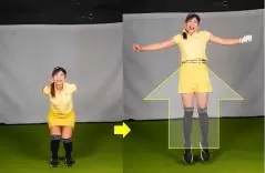 まずは垂直跳びをする要領で、その場でなるべく高く跳ぶつもりで真上にピョンとジャンプしてください。誰もがジャンプする前にヒザを曲げて体を沈めますよね。この動きをスイングの中に取り込むのです。