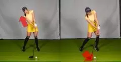ポイントは一旦体を沈めるプロセスが入ること。このタイミングが重結構要です。例えばバックスイングでクラブを上げながら体を沈める人がいますが、これだと早すぎ。インパクトで体ごと伸び上がってトップしたり、チョロのリスクがあります。また、それを避ける動きが入るとボールを当てに行ってダフることもあるので、切り返しで沈むようにしてください。